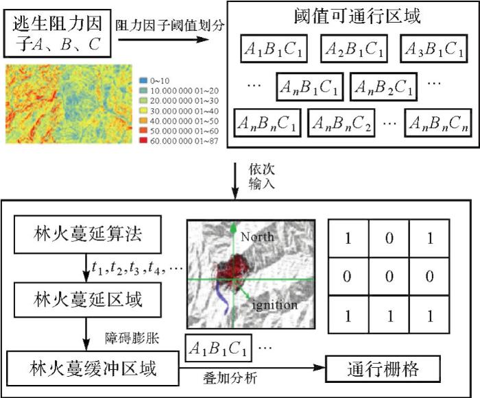利用包含可通行区域与不可通行区域的森林火灾逃生路网通行栅格网络模型以表示森林区域的可通行性特征。其构建流程如图4所示,首先计算不同安全等级下的阈值可通行区域,然后将各个安全等级的可通行区域与t时间内的林火蔓延区域进行叠置分析,最后输出相应安全等级的森林火灾逃生路网通行栅格。知识图谱查询信息表明,坡度和植被覆盖度对森林火灾逃生的安全性影响较大,因此将其设定为用于划分安全等级的森林火灾逃生阻力因子。对每一个逃生阻力因子设定一个最高等级的通行阈值,将其n等分为n+1个通行阈值区间。如逃生阻力因子A划分为{0,A1,A2,A3,…,An},第一个逃生可通行阈值区域为0-A1,第二个0-A2,…,第n个为0-An。依次输出每一个逃生阻力因子的逃生可通行阈值区域,并且互相叠加分析后输出重合部分,即最终有大面积相连区的阈值通行区域(图4)。当可通行阈值的下标越小,意味着在该可通行区域内的路网安全性越高,如A1B1C1安全性最高,AnBnCn安全性最低。