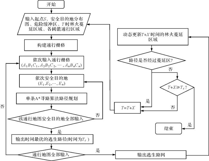 逃生路网动态优化生成算法如图5所示。首先构建不同安全程度的森林火灾逃生路网通行栅格,设置与起点直线距离最短的河流或者道路为安全目的地;然后生成起点与每一可通行安全目的地的逃生路径,输出改进A*算法的森林火灾最佳逃生路径和相应的通行时间;接着,循环全部的通行栅格,生成逃生路网;最后,根据气象数据、植被覆盖数据等数据,更新T+X时间的林火蔓延区域,判断路网是否经过T+X时间的蔓延区。若有路径通过,更新生成逃生路网。若没有,则需再判断T+X是否大于路径通行时间,若小于,则表明此逃生路径可以完全避开林火蔓延区。当逃生时间TC大于林火蔓延时间,则表明此逃生路网仍有受到林火动态变化的影响,需要重新生成。循环动态更新林火蔓延区域与逃生路网,直到路网通行时间小于林火蔓延时间,最终输出安全逃生路网。