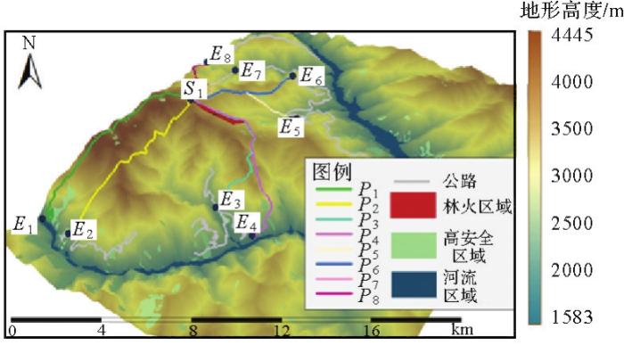 近年来,受到全球气候变化[1]、人类活动干扰和自然资源开发等因素的影响,森林大火在全球范围内频繁爆发[2-4]。据国家林业和草原局(http:∥www.forestry.gov.cn)统计,近十年来我国每年都会有超过20人在森林火灾中罹难,其中森林火灾扑救一线的消防人员更是占到了伤亡人数的绝大部分。准确、高效的逃生路网规划能支持人员应急逃生决策[5-6]。而森林火灾扑救人员伤亡的重要原因之一就是林区中复杂地理环境和多变林火行为易导致森林火灾扑救人员在执行救援任务时误入险境,无法及时判断出快速逃离的路径[7-8]。因此如何设计考虑危险环境和安全地带等森林火灾逃生关键空间信息,并规避动态林火蔓延区域的逃生路网,对辅助扑救人员安全逃生具有十分重要的作用。
