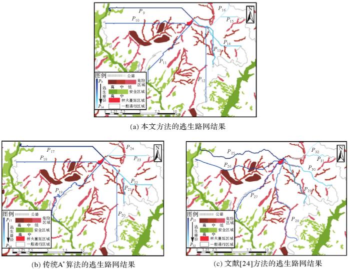 | 方法 | 逃生路网 | LoR(危险区域) | LoR(安全区域) | LoR(一般通行区域) |