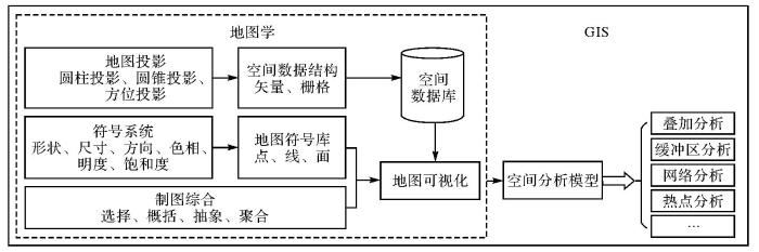 文献[2]指出:GIS源于地图又超越了地图。GIS是一门综合性科学,它的发展涉及地理学、地图学、测绘学、计算机科学等众多学科。其中,地理学是GIS的认识论基础,地图学是其方法论基础[14]。在GIS出现以前,人类主要在地图上进行地理对象的空间位置、空间关系和属性特征描述,地图是集空间对象存储、管理与表达为一体的综合系统。基于地图结果,用户可以进行地理对象的空间定位、属性查询及量算分析等。因此,地图本质上是一个功能相对简单的GIS系统[2]。随着计算机技术的发展,信息空间的介入使地图发生了数字化转型。如图1所示,GIS继承了地图学的思维[15],通过地图投影、制图综合、符号系统,结合空间分析方法,实现对现实世界的分析与表达[16]。