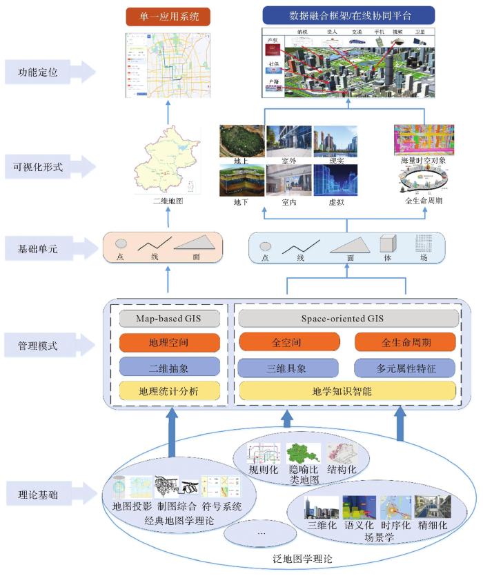 泛地图学理论拓宽了Map-based GIS对象空间、可视化形式及应用领域的范畴。对象空间上,泛地图的对象空间从地理空间拓展到了包括地理空间、社会人文空间、信息空间在内的三元空间[20],地上与地下、室内与室外、宏观与微观、虚拟与现实、有形与无形的空间对象成为GIS的表达对象。可视化形式上,泛地图的可视化形式从单一的图形符号语言向图形符号、思维过程、空间语义、自然语言的有机组合转变,静态-动态、2D-3D、抽象-具象、离散-连续等构成GIS的多元化表达手段[22]。应用领域上,泛地图的用户角色从人拓展到了物。在泛地图理论的支撑下,基于人的应用场景,GIS可以展示空间对象在三元空间中的分布,实现空间对象与人的交互、空间对象间的关系展示;基于物的应用场景,GIS可以辅助物进行自动化、智能化、精细化作业,如自动驾驶、自动分拣、机器人自动巡航等[23]。与经典地图学理论相比,泛地图理论具有信息价值更大、内容更为丰富、实时性更强等特点,有利于提高GIS时空信息组织、表达和分析能力。