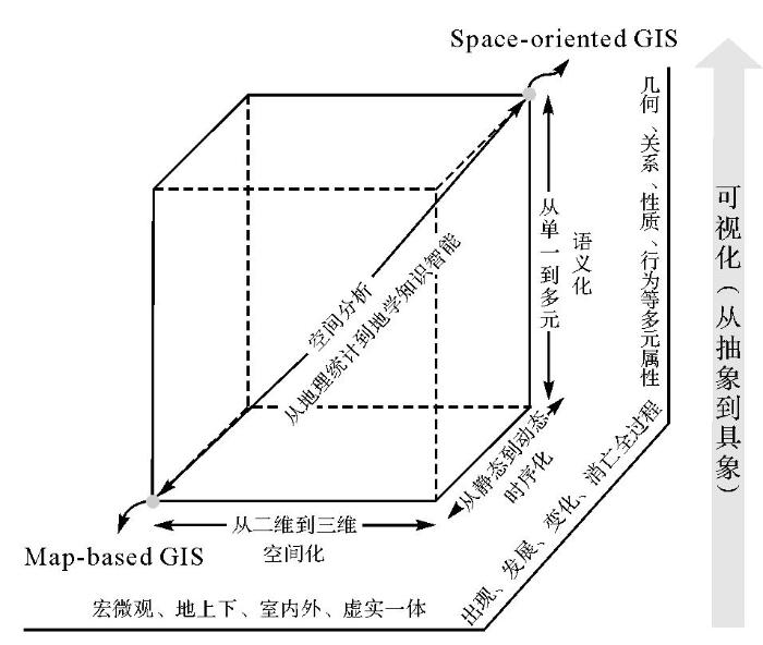 本文基于GIS面临的新技术与新需求两方面的挑战,按照科学性与系统性原则,从基础理论、管理模式、可视化形式、功能定位等不同视角,进一步拓展GIS的科学概念。GIS的理论基础从经典地图学理论拓展到泛地图学理论,管理模式从Map-based GIS拓展到Space-oriented GIS模式,可视化形式从二维静态拓展到多维动态,功能定位从单一的应用系统拓展到数据融合的框架与在线协同的平台。从Map-based GIS到Space-oriented GIS科学概念转化表明,GIS未来将不断深化。空间化、三维化、过程化、精细化、智能化成为GIS的新特征,赋予其面向更加多元化、多层次、多类型空间对象表达与分析的能力。随着智慧城市、数字孪生和实景三维建设的深度推进,未来GIS将具有更为丰富多元的应用模式与应用前景。