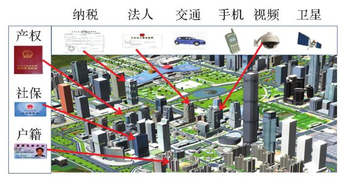 (1)智慧城市。基于大数据、云计算、物联网、BIM技术等,Space-oriented GIS能够通过融合基础地理信息数据、全空间三维模型数据等城市基础时空数据(图6),政务、土地、小区、建筑、房屋、自然人、法人、交通等城市实体数据,物联网感知数据、互联网开放数据等城市运行状态数据,以及基础管理对象、行业管理对象等城市管理对象数据,生成具有统一时空基准、实体相互关联、属性状态协同更新的数字化平台,实现空间对象的实景化、精细化、协同化、动态化表示与全生命周期管理,为城市智慧规划、智慧交通、智慧城管、智慧政务、智慧社区等提供一体化支撑,服务于户政、交通、治安等城市治理的多元化需求。