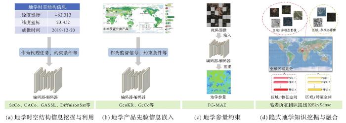 ... 地学知识主要包括地表人类活动与自然演变呈现的规律性时空先验信息和领域专家知识[78].基于深度学习的智能遥感解译模型往往以数据驱动为主,解译模型的泛化性较低,同时缺乏足够的可解释性.为了弥补这一不足,引入地学知识成为提升解译模型性能的有效手段.本节首先回顾了地学知识引导的智能遥感解译技术,然后着重探讨了地学知识在提高智能遥感解译模型性能和可解释性等方面的潜在作用,最后对目前遥感基础大模型挖掘和利用地学知识的方法进行了分类阐述,旨在为未来相关研究提供参考和启示. ...