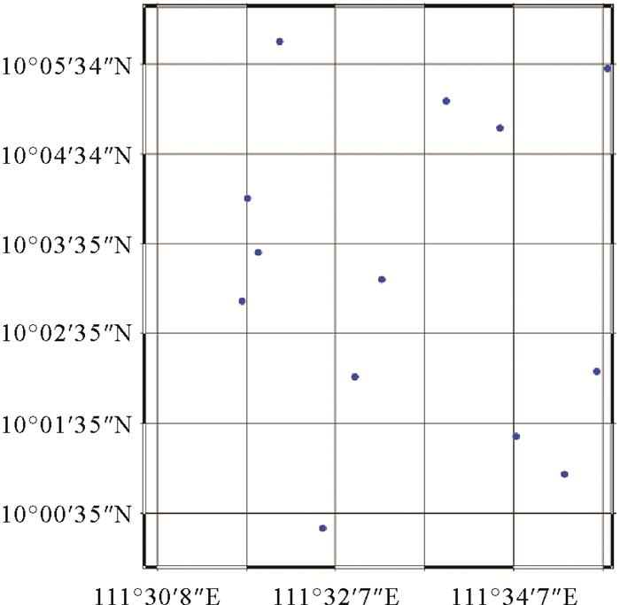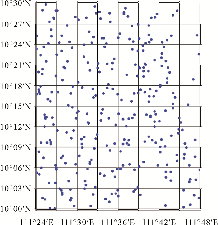 | 图 3 SARAL卫星1 Hz海面高数据在3′×3′格网内的分布(蓝色圆点代表测量值) Fig. 3 Distribution in 3′×3′ grid of 1 Hz sea surface height data from the SARAL satellite (blue dots represent measurements) |
