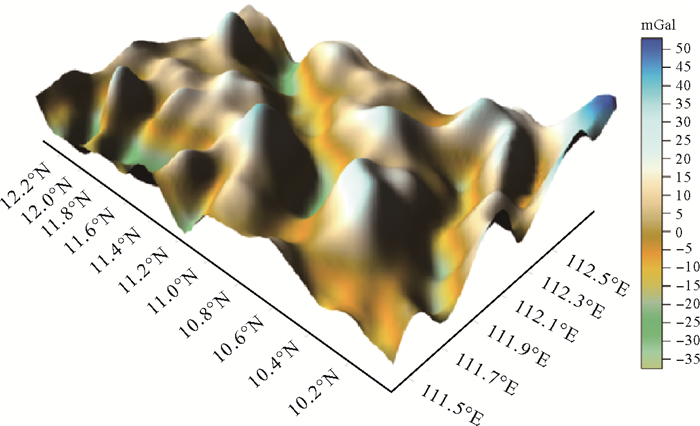 由图 2、图 3可知,SARAL卫星1 Hz海面高数据在1′×1′格网内的分布很不均匀,不能完全达到1′×1′分辨率要求,总体上测量点格网分辨率优于3′×3′。实际重力场反演分别按照1′×1′、3′×3′格网大小进行计算,这样做的原因主要考虑以下3个原因:一是为了与已有1分格网船载重力数据进行比较,方便给出SARAL卫星反演重力场的精度;二是同时为了方便利用国际已经发布的1分格网的ETOPO-1、DTU18模型;三是考虑到本文方法需要在小区域利用已知格网观测量进行求解,而理论上格网划分越细,效果越好,同时考虑到目前试验区已知的船载水深格网模型为1′×1′格网,因此,采用1′×1′格网进行计算有利于对方法进行验证。计算中为避免远区项影响,采用移去恢复方法,先验模型采用2160阶EGM2008模型,按照式(1)—式(3)计算得到南海区域扰动重力如图 4所示。