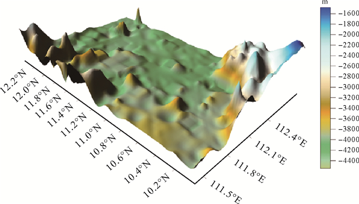 由于曲面函数需要估计5个参数,这就使得重力观测格网数据有最小解算量,过少的观测量估计的参数准确度偏低,过多的观测量又会降低参数的适应范围,从而降低对高频信息的恢复。为了考察不同格网大小划分对计算结果的影响,将区域格网划分设定为3×3格网(即每个小区域有9个1′×1′格网)、4×4格网、5×5格网、6×6格网、9×9格网、10×10网格和12×12网格,不同格网划分条件下的计算结果见表 3,其中基于10×10网格划分反演得到的海底地形三维图形如图 5所示。