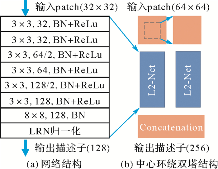 1.2 深层神经网络L2-NetL2-Net网络[16]共由7个卷积层组成(图 1),所有卷积层采用padding补0(除最后一层卷积)以保证图像尺寸不变。为了保证描述符的性能,网络采用步距为2的空洞卷积实现影像降采样。除最后一层无激活层外,每个卷积层后接ReLU函数和BN(batch normalization)层,并且BN层的参数在训练过程中不变。网络最后使用LRN(local response normalization)层输出128维的特征向量。在训练数据构建时随机加入部分学习过的数据,让网络有机会回顾已经学过的内容。训练中的负样本来自正样本输出的描述符距离矩阵,且所有非对角线元素作为负样本。L2-Net的损失函数包含3个误差项:描述符相似度、描述符紧凑度和中间特征图相似度;在度量描述子相似性时,使用相对距离划分匹配和不匹配的图像块对。另外,为了学习多尺度特性,L2-Net也提供了中心环绕双塔结构,输出256维特征向量。