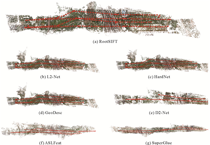 考虑重投影误差指标,得益于RootSIFT的高精度定位能力,L2-Net、HardNet和GeoDesc的重投影误差基本上达到1个像素的精度,特别是对于倾角较小的数据2和数据3。与特征匹配类似,D2-Net的精度最低,4组试验数据的重投影误差均大于1.3像素。另外,基于多尺度特征点检测,ASLFeat和SuperGlue的SfM三维重建精度相当。对于数据2数据,图 11显示了基于不同方法特征匹配点的SfM三维重建结果。