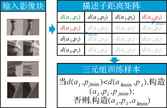 除了网络模型设计,训练样本采样和Loss函数设计直接决定了网络模型的学习性能。早期的深度网络常采用影像块对{p1, p2, l}和对比度损失函数(contrastive loss)实现对远距离正样本和近距离负样本惩罚。然而,大部分负样本距离明显大于正样本,导致网络无法高效学习高可区分的特征描述。受到SIFT匹配中比值测试启发,HardNet[17]提出难负样本采样(hard negative sampling)和三元组边界损失函数(triplet margin loss),如图 2所示。与L2-Net类似,HardNet根据正样本对构建的描述符距离矩阵,为每个正样本对{ai, pi}选择一个距离最小的负样本ni,即最难区分的非匹配对,构建三元组样本{ai, pi, ni}。然后,利用三元组边界损失函数进行网络训练,其目的是增加网络对正样本及其对应最难区分负样本对之间的相对距离,进一步提升网络区分正负样本的判别能力。HardNet采用L2-Net的网络架构。