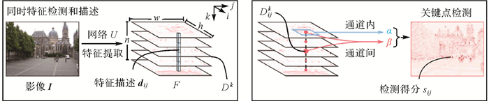 1.5 同时检测描述网络D2-Net由于特征检测子所依赖的局部底层信息(比如影像灰度)受到环境光照变化的影响明显,导致传统先检测再描述特征提取算法的可重复性显著降低。为此,D2-Net网络[20]采用同时检测描述的思路进行特征提取(图 3),其最大的特点是“一图两用”,即网络生成的特征图既代表特征检测结果又代表特征描述结果。对于输入CNN网络U的影像I,可得到3D特征图F=U(I), F∈Rh×w×n。其中n是特征图的通道数;h×w是特征图的高和宽。因此,从通道维度看,F可看作h×w个n维特征向量dij;从空间维度看,F可看作n个特征检测子输出的响应图Dk。为了实现特征点提取,D2-Net设计了类似SIFT关键点检测方法,即从空间维度和通道维度同时计算像素点的检测得分sij。D2-Net采用VGG16网络conv4_3前的部分,并在triplet margin ranking loss基础上加入了提升特征点检测可重复性的优化目标:利用检测得分对triplet loss加权,保证显著性描述子具有更高的检测得分。D2-Net在网络训练时使用了低分辨率特征图,测试时将分辨率提升到原图的1/4,以提高特征定位能力。
