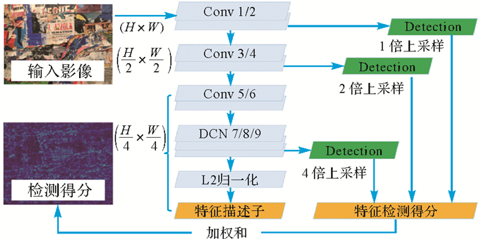 现有端到端学习的特征检测和描述网络忽略了特征点支撑域几何变形和定位精度低的问题,导致深度特征难以用于影像配准、三维重建等高精度几何应用。因此,在D2-Net提出的同时检测描述网络模型的基础上,ASLFeat[21]针对上述两个问题进行优化(图 4)。对于特征点支撑域几何变形的问题,提出利用可变形卷积网络(deformable convolutional network, DCN)学习预测特征点局部区域的几何变换,得到具有视角不变的特征点支撑域。考虑到影像局部区域几何变形的有限复杂度,ASLFeat分别利用相似、仿射和单应变换约束局部几何变形。对于特征点定位精度低的问题,ASLFeat提出利用卷积网络内在的金字塔分层特征,实现多尺度的特征点检测,避免D2-Net在低分辨率特征图上特征检测所造成的低定位精度。另外,ASLFeat采用L2-Net的轻量化网络:仅将L2-Net最后的8×8卷积层替换为3个3×3的DCN卷积层,并利用第2、4和9层输出的特征图实现多尺度特征检测。