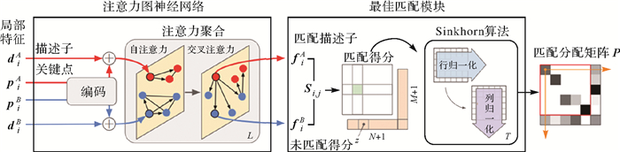 与现有大部分网络聚焦于特征点检测和描述所不同,SuperGlue[22]利用神经网络学习如何进行特征匹配。其基本出发点是:网络模型可以学习提取高可重复性、高可区分性的特征点。但是,弱纹理区域或重复结构往往导致常规的特征匹配策略并不能得到足够数量的匹配点,比如结合描述子欧氏距离和比值测试的匹配策略。受到Transformer和图匹配思想的启发,SuperGlue提出结合注意力机制和图神经网络的深度学习匹配方法,如图 5所示。整个网络架构包括注意力图神经网络和最佳匹配模块。其中,注意力图神经网络模拟人寻找匹配点的过程:将输入的关键点pi=(x, y, c)和描述子di编码为高维向量,并迭代利用自注意力和交叉注意力增强描述子的匹配性能,得到模块输出的匹配描述子fi。最佳匹配模块则模拟图匹配过程:利用匹配描述子fi构造匹配得分矩阵,将特征匹配问题转化为最优传输问题,并基于Sinkhorn算法迭代求解最佳的匹配分配矩阵P(其行列元素和为1),实现特征点匹配。