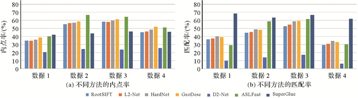 对于SuperGlue所代表的特征匹配网络,能够利用全局上下文信息区分正确和错误匹配点,显著地提升了4组数据的匹配率,分别达到了68.4%、63.3%、66.8%和61.9%。对于影像匹配对和内点率两项指标,SuperGlue在数据1和数据4上能够达到与RootSIFT相当的性能。但是,对于数据2和数据3,其性能缺显著降低。本文认为数据2和数据3属于纹理和结构都相似的场景,给SuperGlue的特征提取和匹配造成困难。