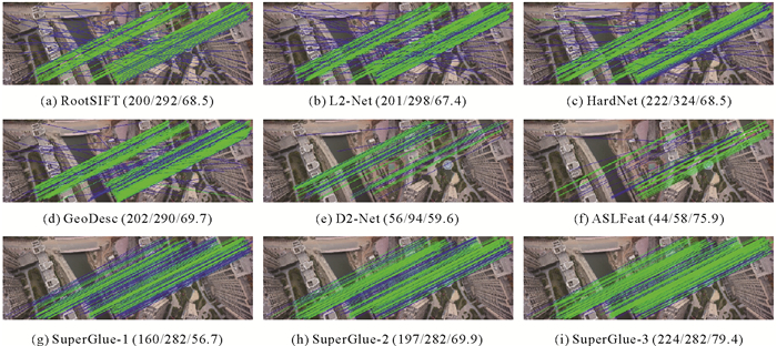 为了进一步分析不同方法的特征匹配性能,选取数据4中的两个影像对进行特征匹配,并统计了内点数、初始匹配数和内点率3个评价指标。试验结果如图 9和图 10所示。其中,正确匹配和错误匹配分别利用绿线和蓝线表示。第1个影像对视角差异较小。可以看出,RootSIFT与L2-Net,HardNet和GeoDesc的性能相当;由于仅利用欧氏距离测度,这4类方法的初始匹配包含了大量的错误匹配。采用联合特征检测和描述模型,D2-Net和ASLFeat可以显著减少错误匹配。但是,受限于特征点定位精度和对于大倾角透视变形的影响,导致提取的匹配点数量显著降低,如图 9(e)和(f)所示。相反,SuperGlue可以显著减少明显错误匹配点,如图 9(g)所示。考虑到SuperGlue采用SuperPoint进行特征提取,仅具有像素级的特征点定位精度。本文进一步设定RANSAC的外点阈值为2、3个像素进行匹配,其内点率快速提升至69.9%和79.4%。可以看出,SuperGlue的特征匹配策略能够显著提升匹配内点率。但是,当影像对视角差异较大时,联合特征检测描述网络和特征匹配网络的性能显著下降,直接导致无法得到匹配点,如图 10(e)—(i)所示。这也导致D2-Net,ASLFeat和SuperGlue获取的影像匹配对数量相对较少,见表 2。